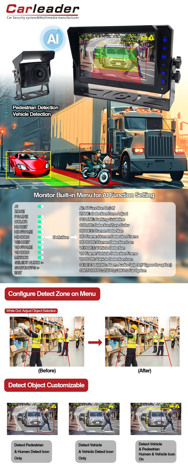 Carleader 7 Inch AI BSD Macula Blind Detectio Monitoring System Support AI Calibration designatus est cum algorithms algorithms altum-precisionis et usoris cz operatione menu. Haec AI camera ratio rectoribus tempestatibus omnibus praebet, alta praecisione pedestrem et vehiculum dynamicam admonitionem, efficaciter minuendo periculum negotiationis accidentium. AI magna ratio camerae magnae apta est carris privatis, classibus mercatoriis et vehiculis specialibus. Classis AI ratio validam integrationem et compatibilitatem, durabilitatem et realitatem temporis magnas facultates habet.