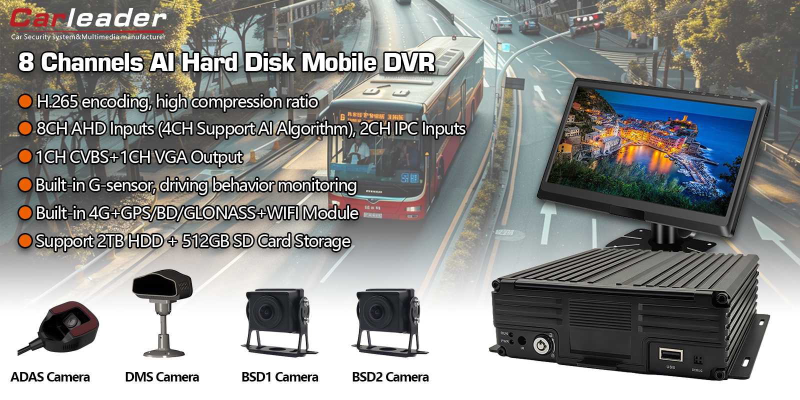 Carleader8CH AI HDD Mobile DVR Support ADAS+DMS+BSDperfecta solutio est classibus mercatoriis, vecturae publicae, logisticae et vehiculis specialibus indigentibus;
