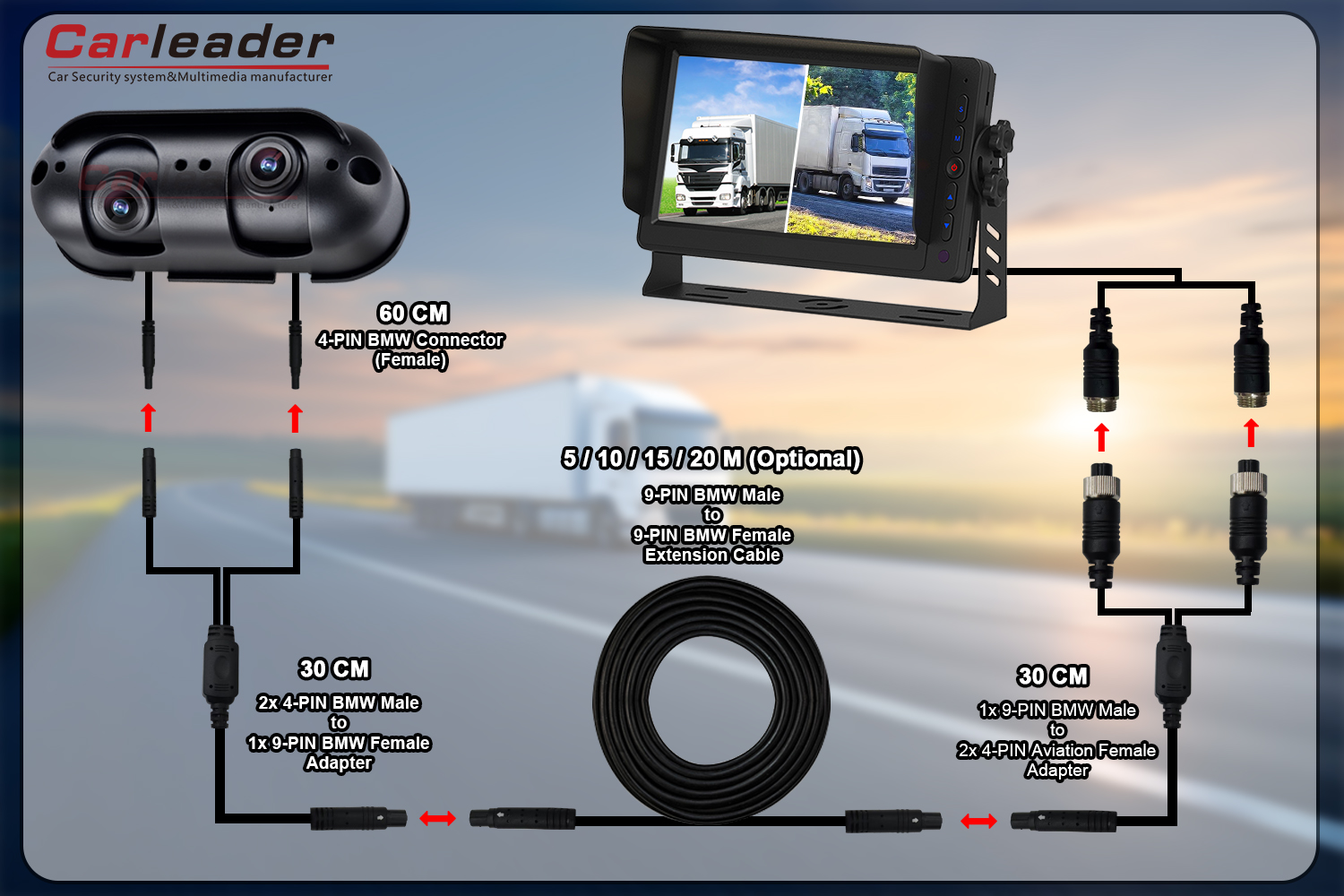 Prima solutio solum unum funem extensio (connexum 9-PIN BMW adhibet), 1 ad 2 funem scissilis utrique finis ad connectendum cameram et monitorem. Quia haec solutio solum nos in fune extensionis, quae faciliorem et faciliorem processum efficit wiring.