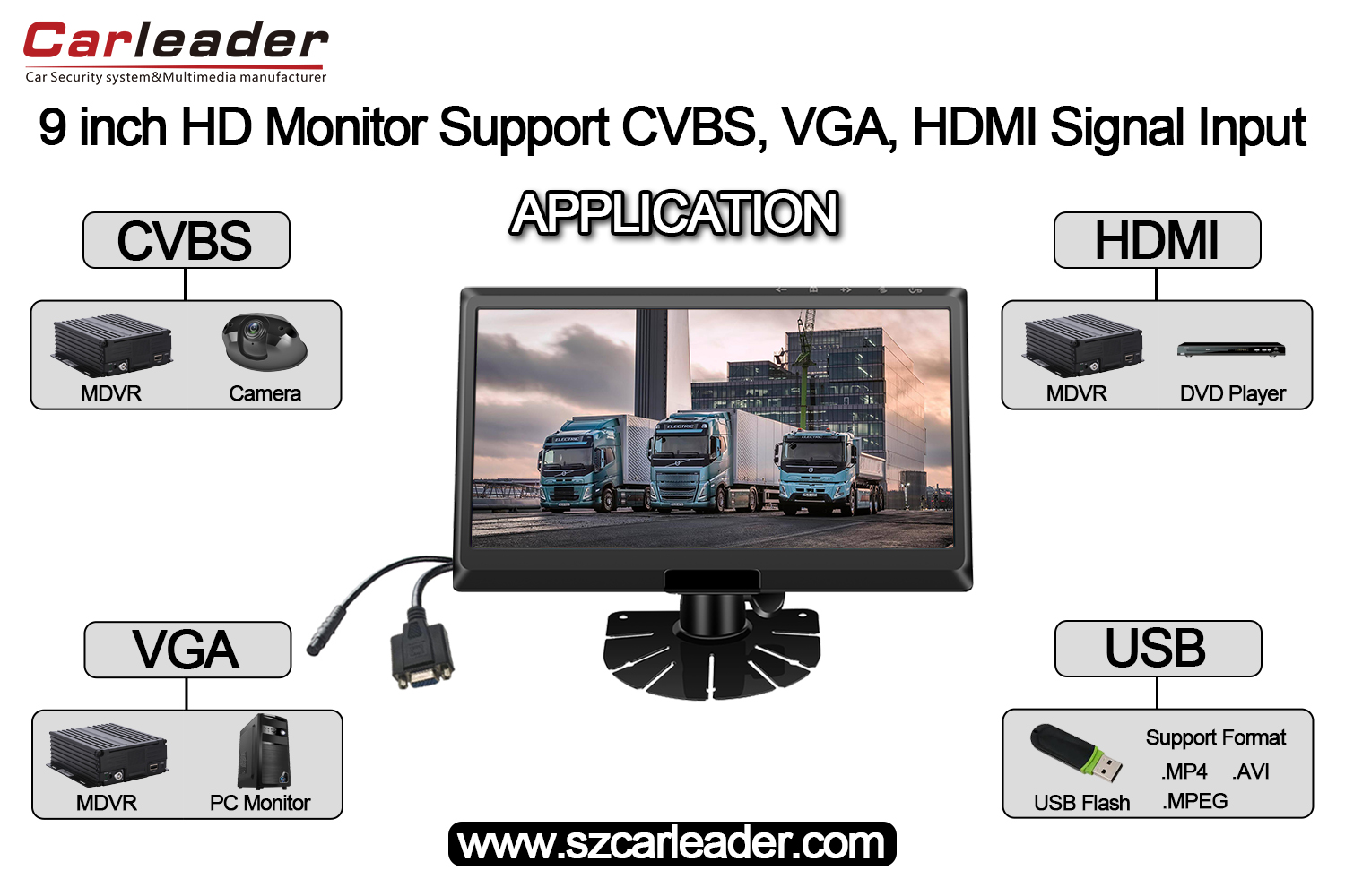 Carleader9 Inch IPS Screen HD Monitor Support CVBS+HD+VGA Inputsprinceps HD monitor effectus vehiculi vigilantia et MDVR classis administratio destinata est. Monitor autocineticus CVBS, HD et VGA signum initibus sustentat. Et si MDVR interfaciem VGA vel HD habet, uti potest cum monitore 9 inch IPS autocineto carro uti.