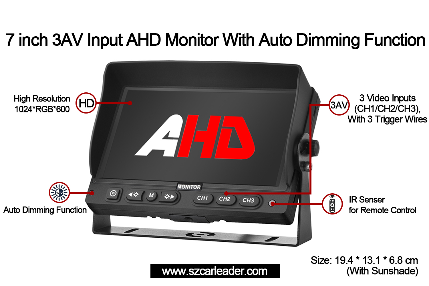 Perfecta classi procuratio, magna vigilantia securitatis, vel usus industrialis, Carleader7 Inch 3CH AHD Inputs Vehiculum Tergum Monitorcomponit firmitatem, versatilem et innovationem usor-centricam in forma pacta.