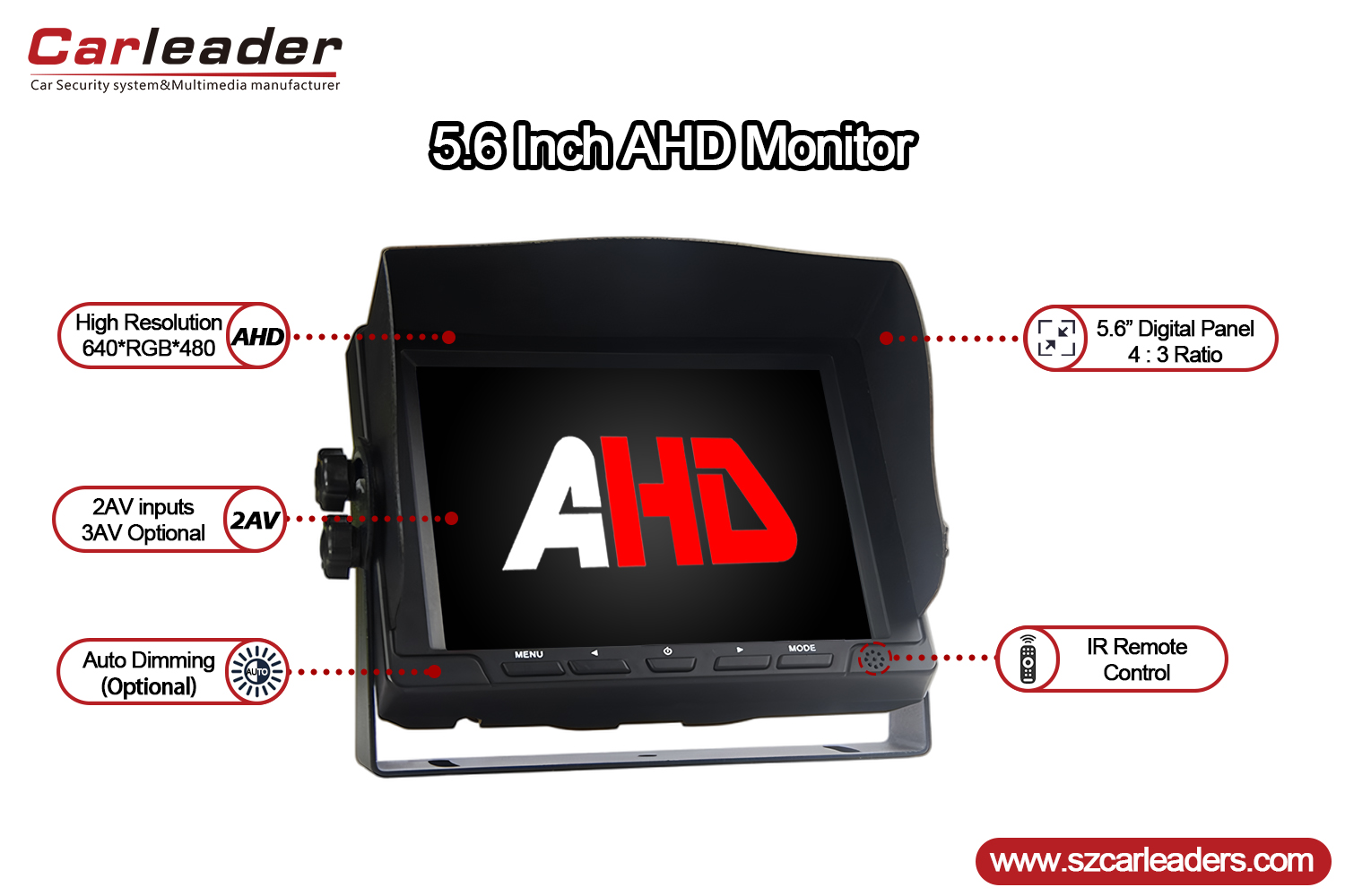 Carleader5.6 Inch 2CH AHD Inputs Vehiculum Tergum Monitoridealis aliquet, buses, RVs, et quodlibet vehiculum ubi visibilitas et salus posteriora aucta sunt prioritatibus. Eius durabilis constructio, manifesta ostentatio, et practica lineamenta certam componentem efficiunt pro modernis systematibus camerae vehiculi.