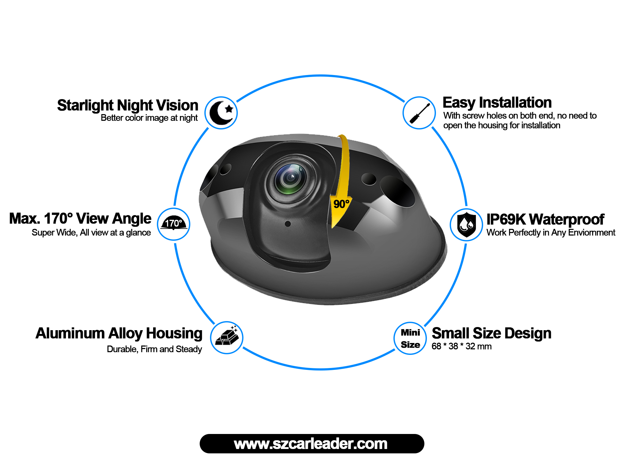 Vehiculum in agro, CarleaderAHD 170 Degree View Angle IMPERVIUS Gravis Officium Tergum Cameralate adhibentur in aliquet, busibus, negotiis scholae, RV machinalis machinalis et aliis gravibus vehiculis. Adhiberi potest ut ante, latus et postico ad visum camerae, et etiam cum MDVR coniungi potest ut recordationem video, remotam vigilantiam, classem administrationem aliaque munera.