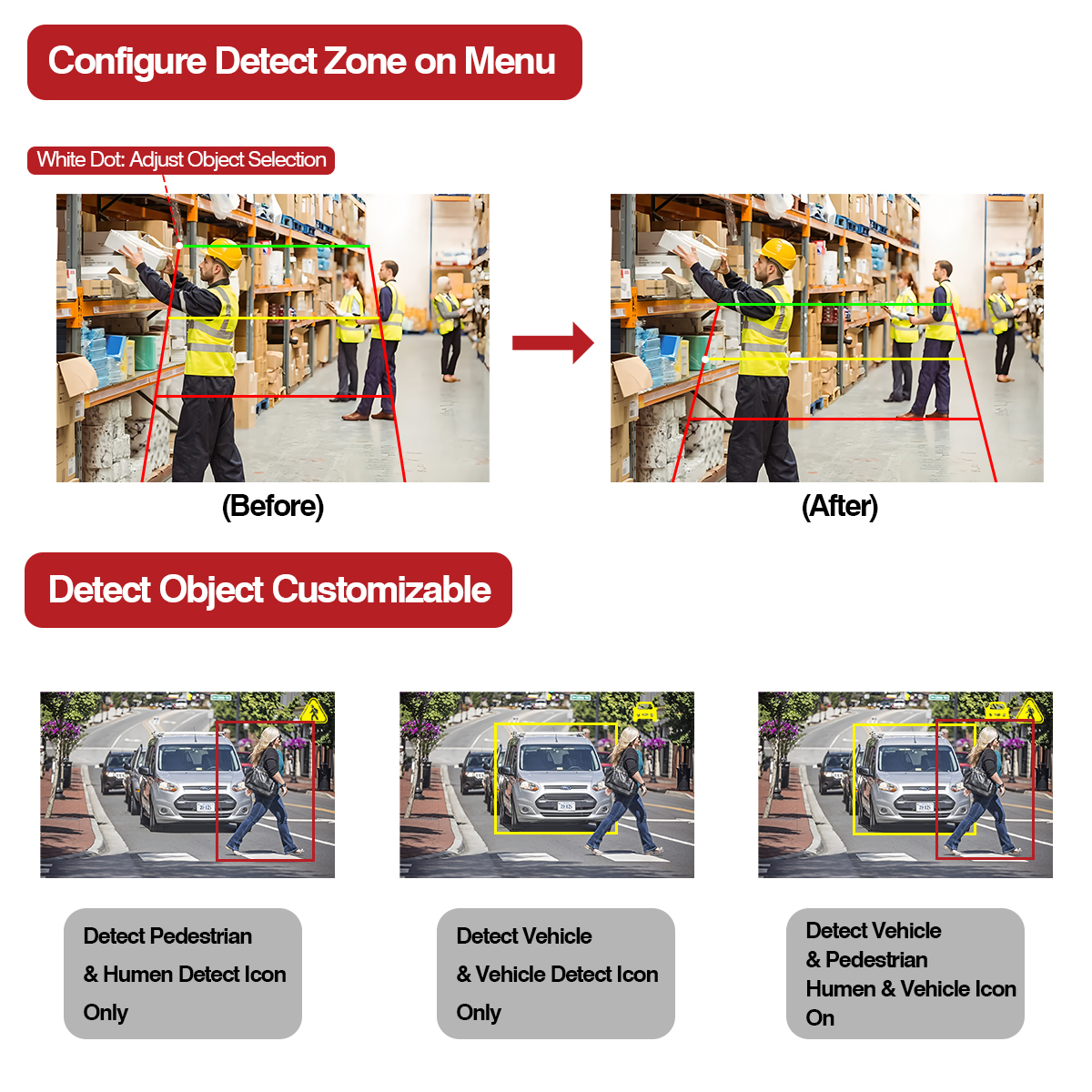 Haec AI Camera cum aedificato-praemonitione functionis luminis, color lucis mutabitur ad respondentem colorem, cum objectum detectionis in varias regiones deprehendatur (Red, Yellow, Viridis). Etiam cum terrore circumiecto pedestrem et vehiculum complent qui appropinquant ad vehiculum tuum.
