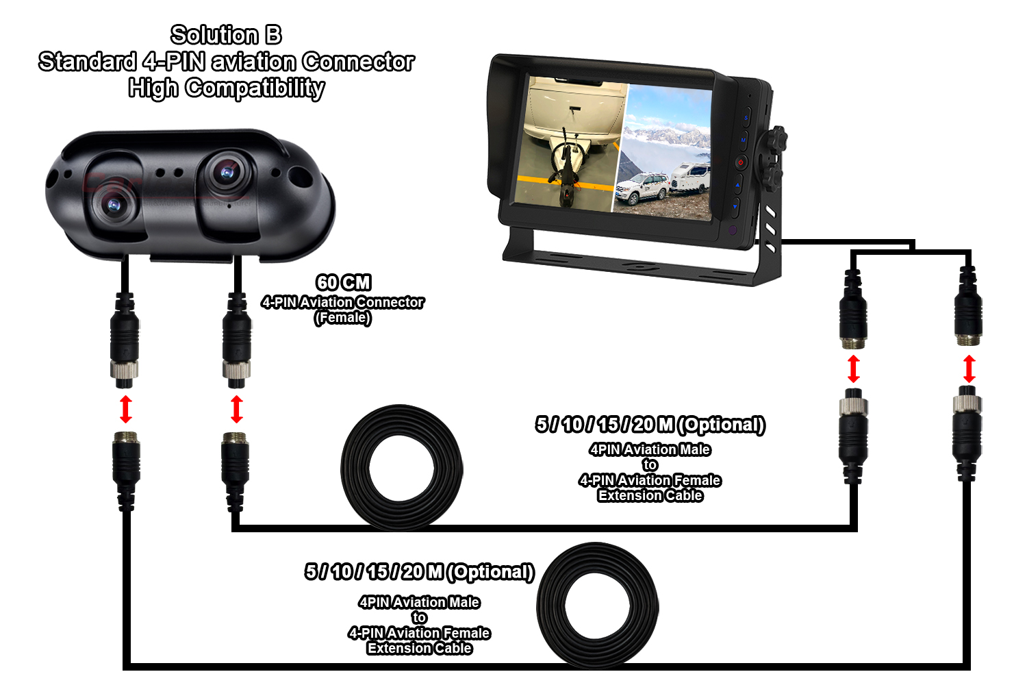 Secunda solutio duo funes extensionis habebit, at definitio camerae vexillum 4-PIN aviationum connectens est, dum extensio tua funis est vexillum 4-PIN aviation connectens, compatibilis erit pro fune extensionis tuae.