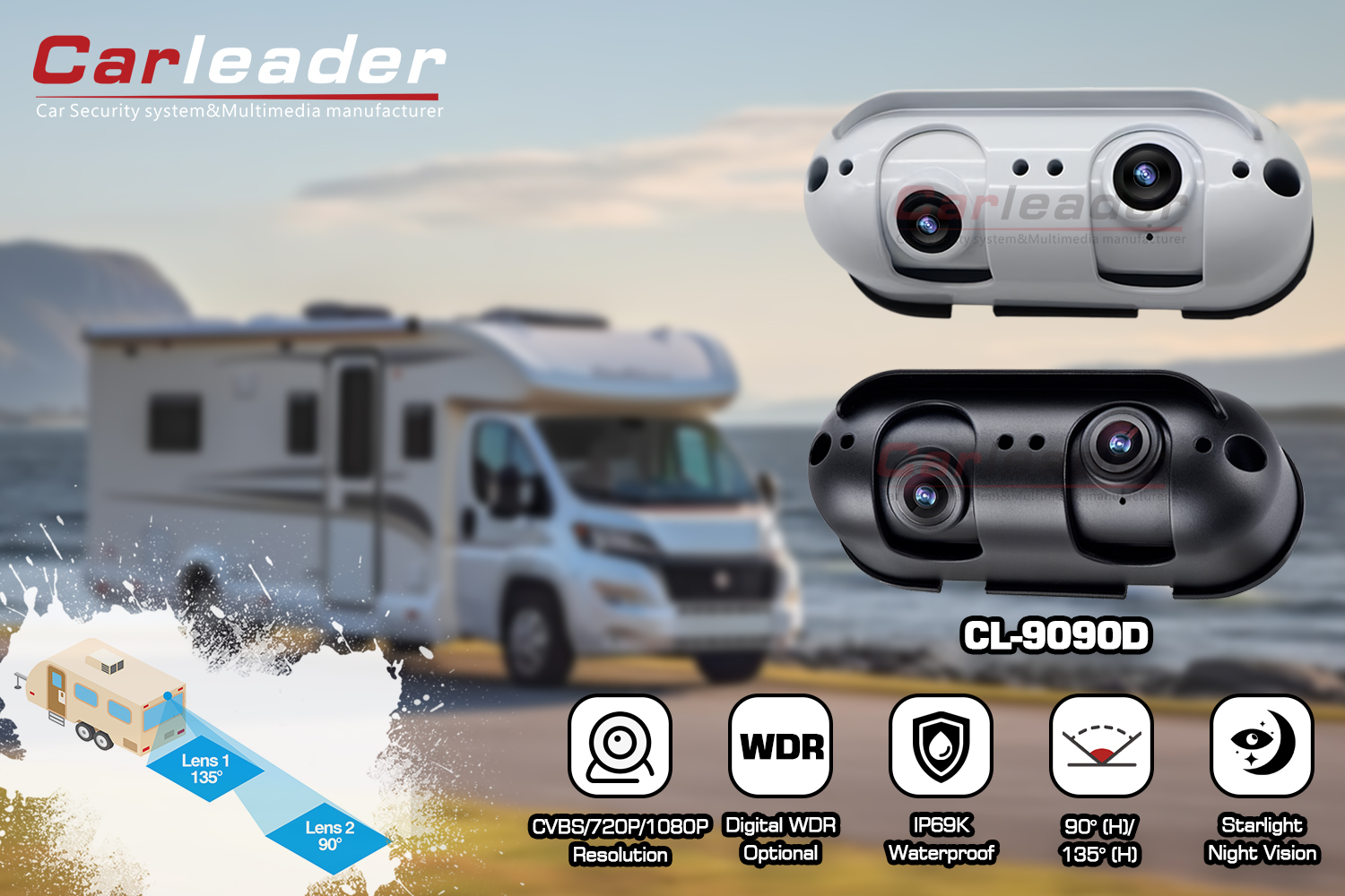 CarleaderAHD Starlight Dual Lens Audi View Camera fit enim RV Motorhome, instrumentum privatum AHD posticum visum cameram de Carleader, lens dualis designatio permittit utentem habere manifestam visibilitatem observantiam proximae et longinquae visus aspectus rear. Aluminium eius admiscuit habitationem et IP69K aestimationem cameram firmiorem et durabilem in omni condicione tempestatis facit. Camera haec non solum apta ad gravia onera vehiculorum, sicut plaustrum, bus, forklift, etc; item ad vehiculum motorhome idoneum, sicut RV et viatores.